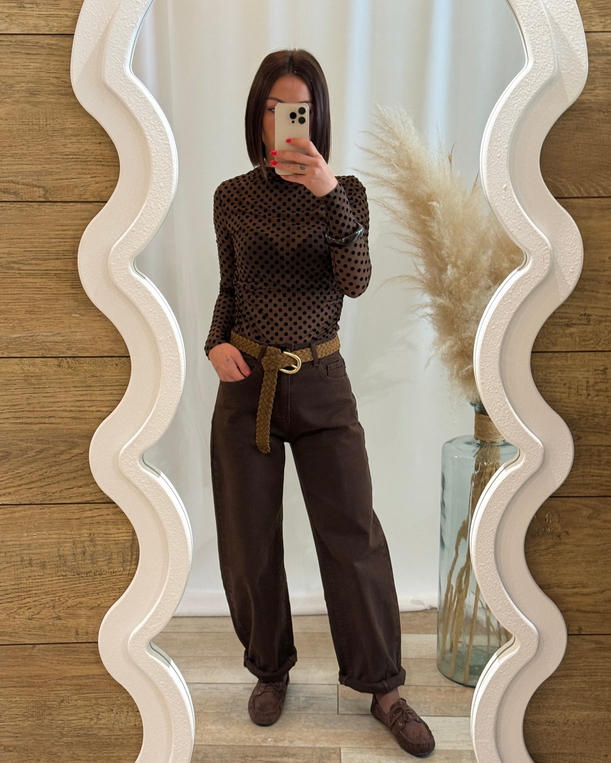 Sa taille haute et sa couple ample aux jambes apportent une allure moderne.