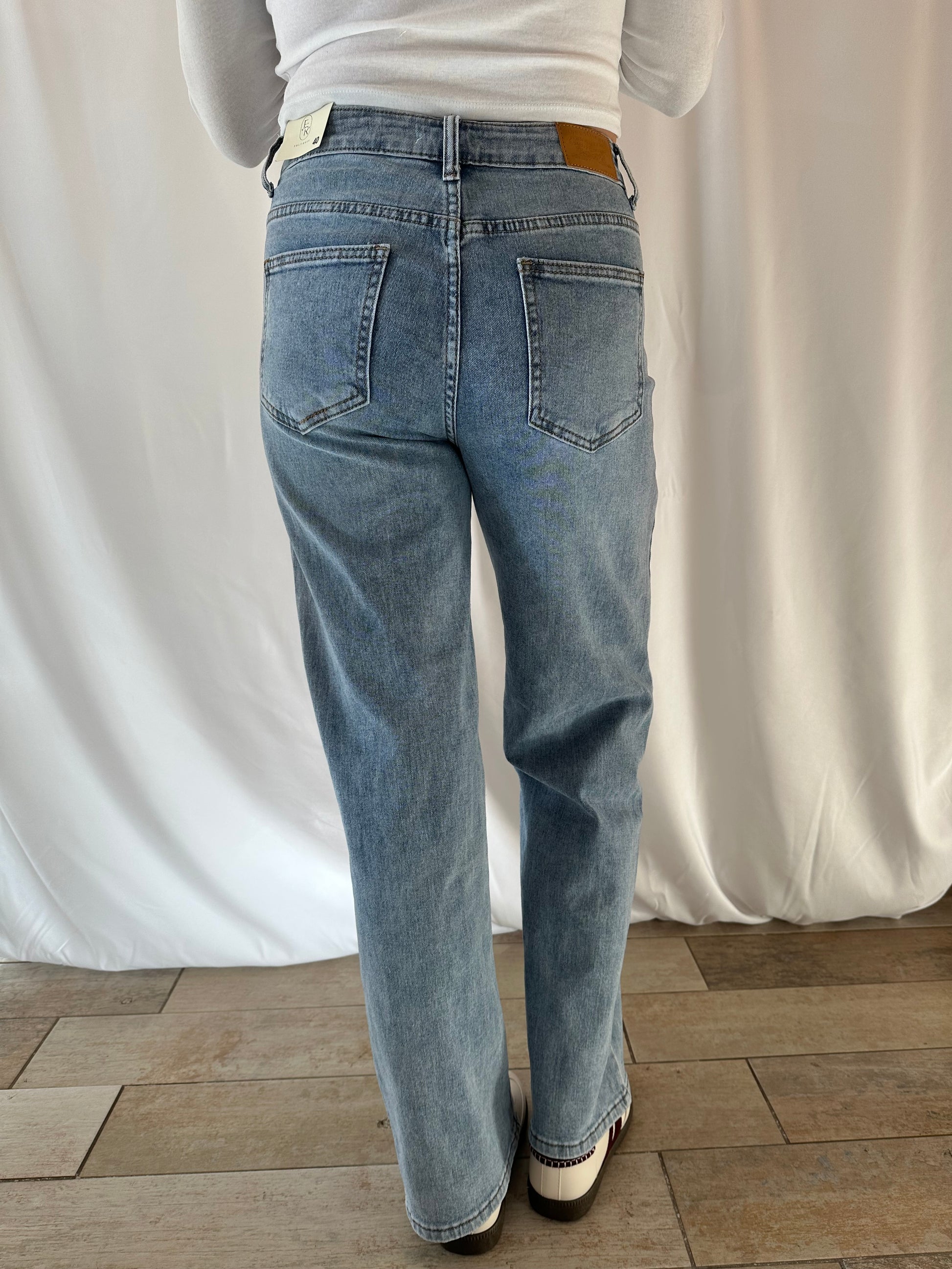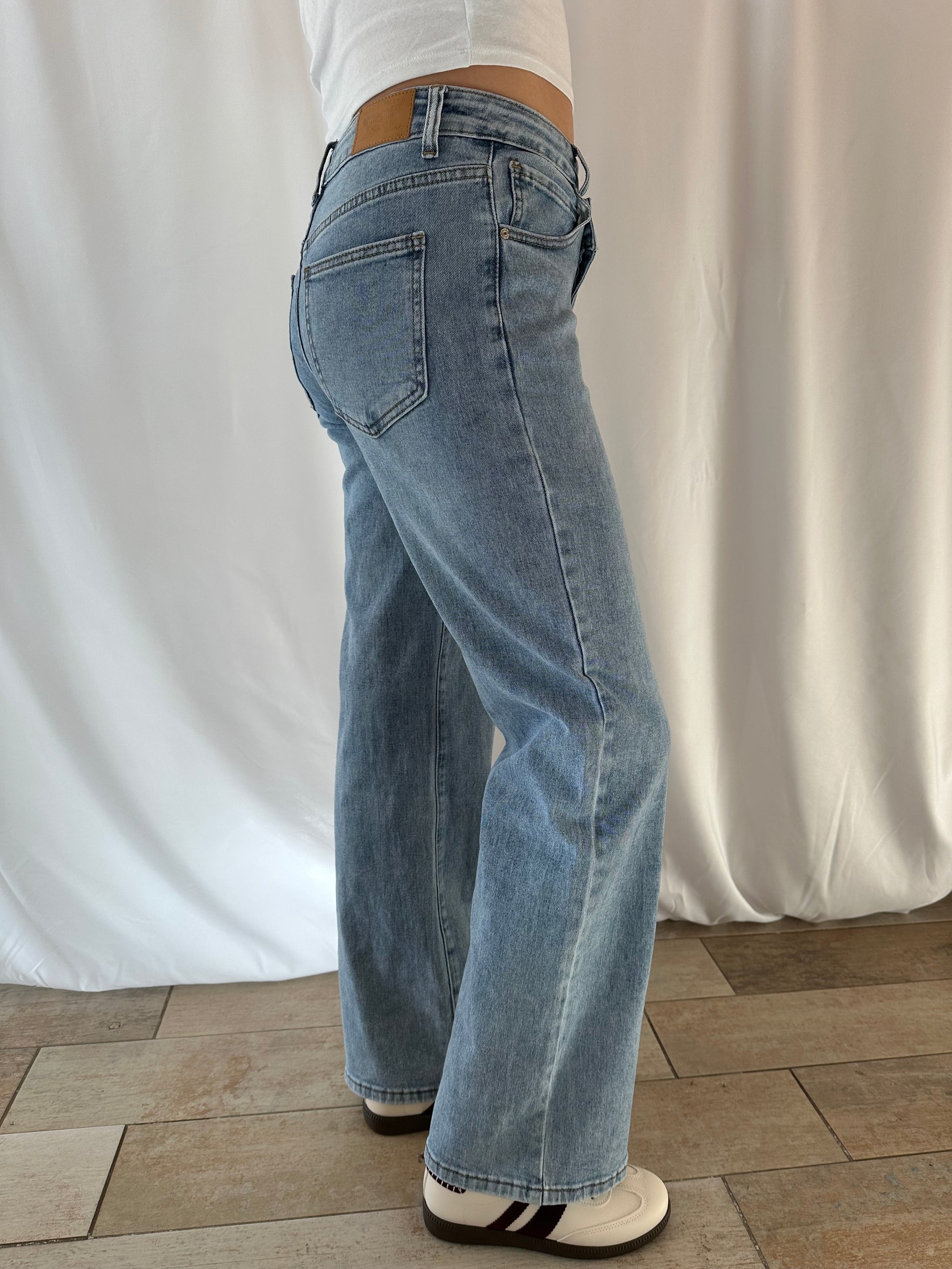 Jean Wide Leg taille haute avec bouton décalé. Sa coupe hyper confortable et sa touche unique assure un look moderne.