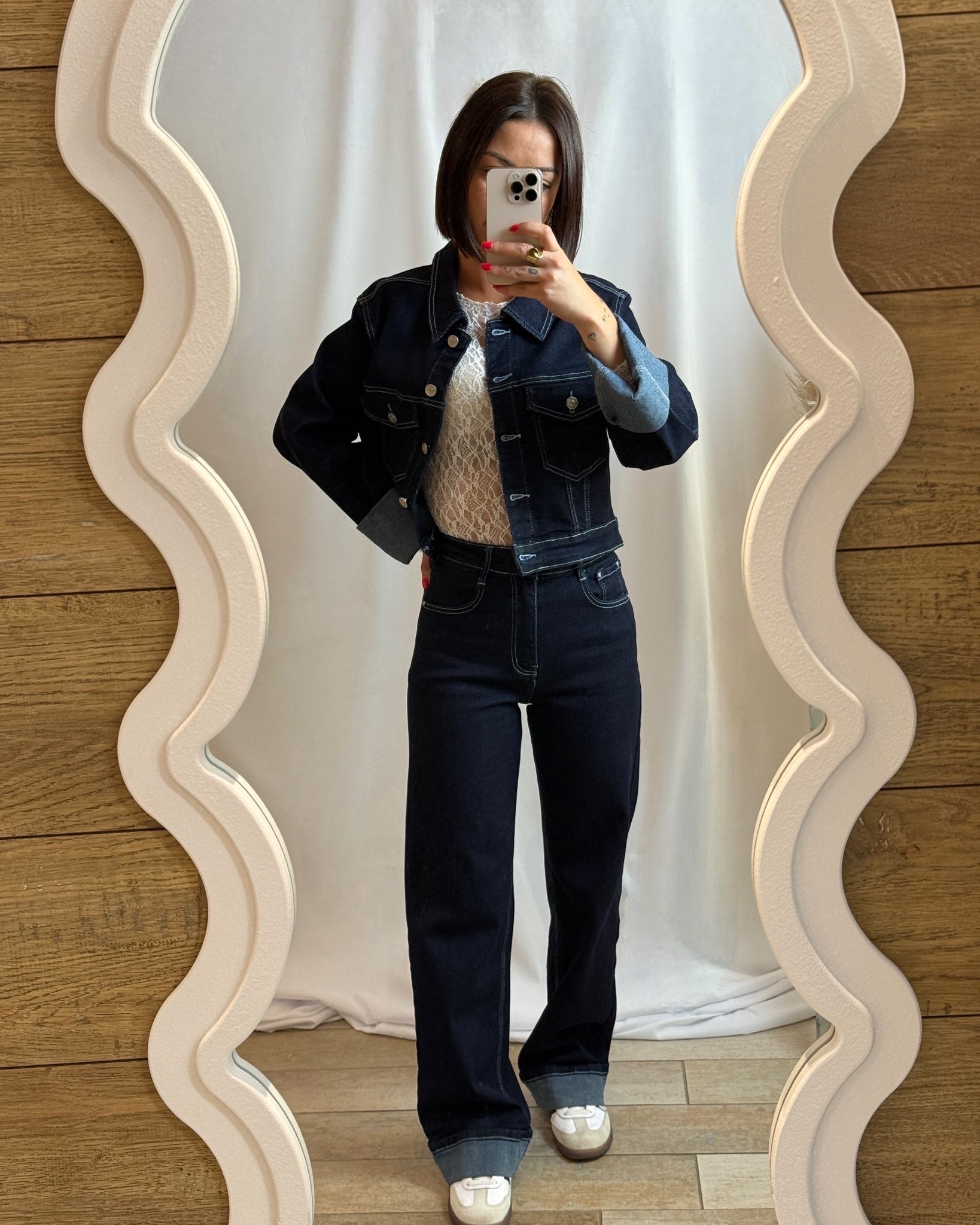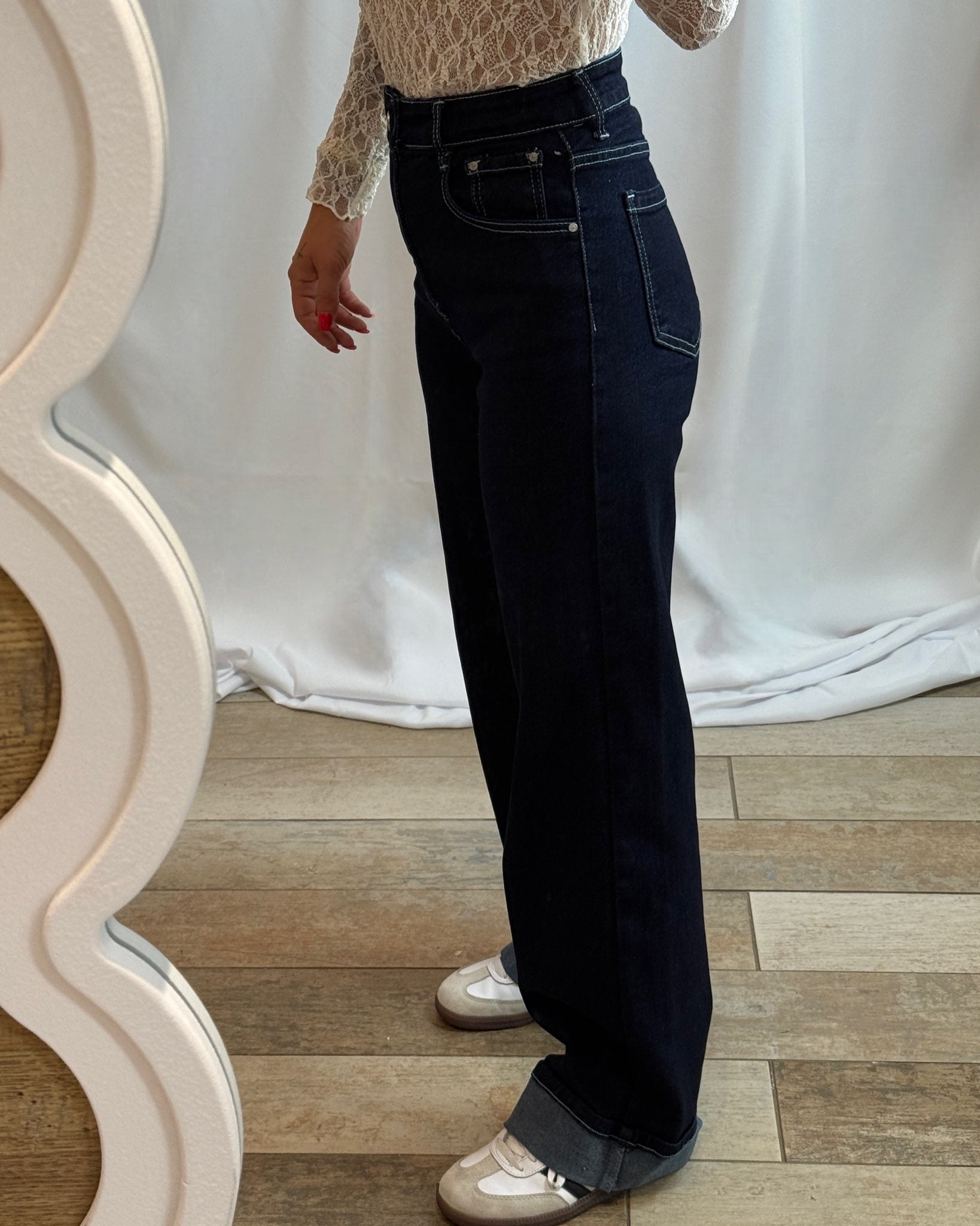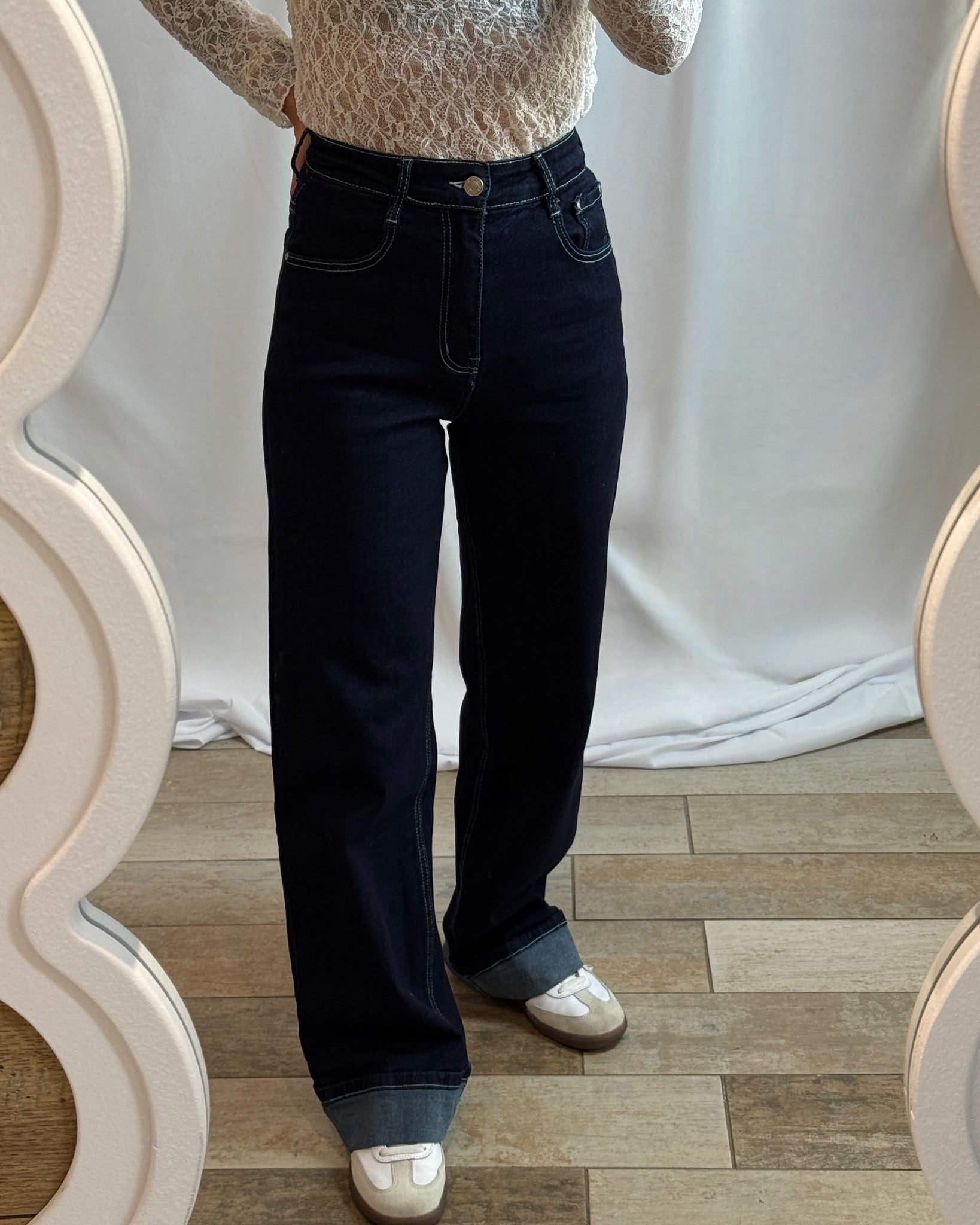Jean brut coupe droite, taille haute avec ourlets sur le bas de jambe.