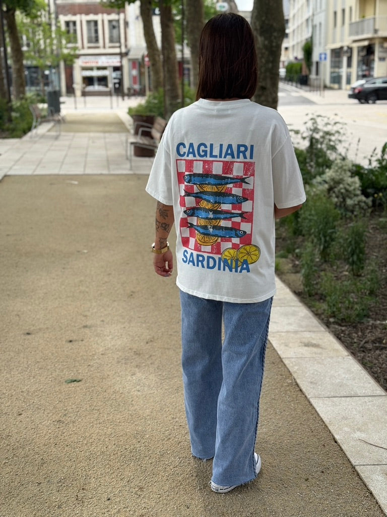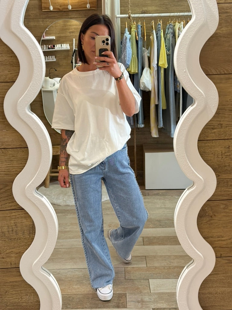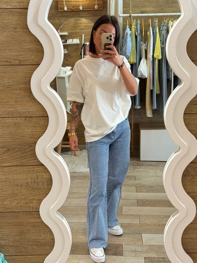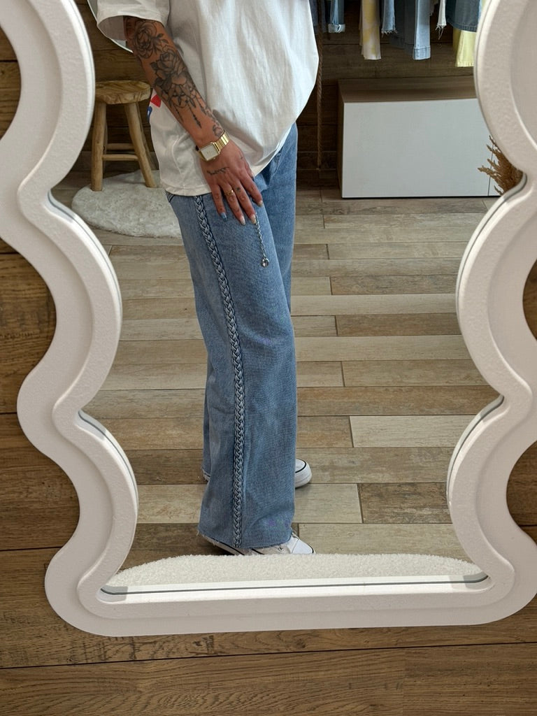 Jean bleu ciel tressé sur le côté, coupe large avec finition effilochée taille haute avec poche avant et arrière. Fermeture zippée + bouton.