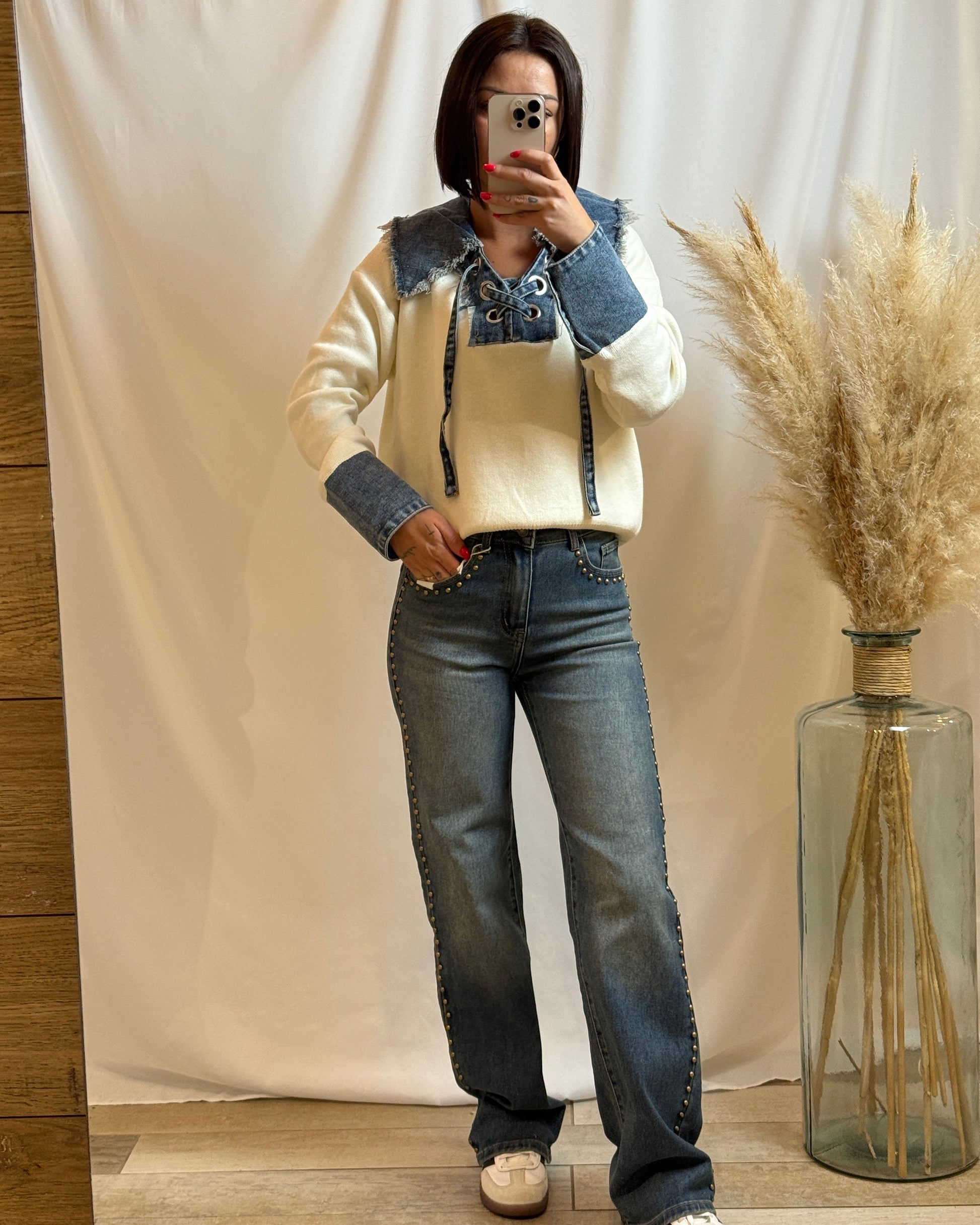 Jean coupe Wide Leg avec détails cloutés, assure un look tendance et audacieux.
