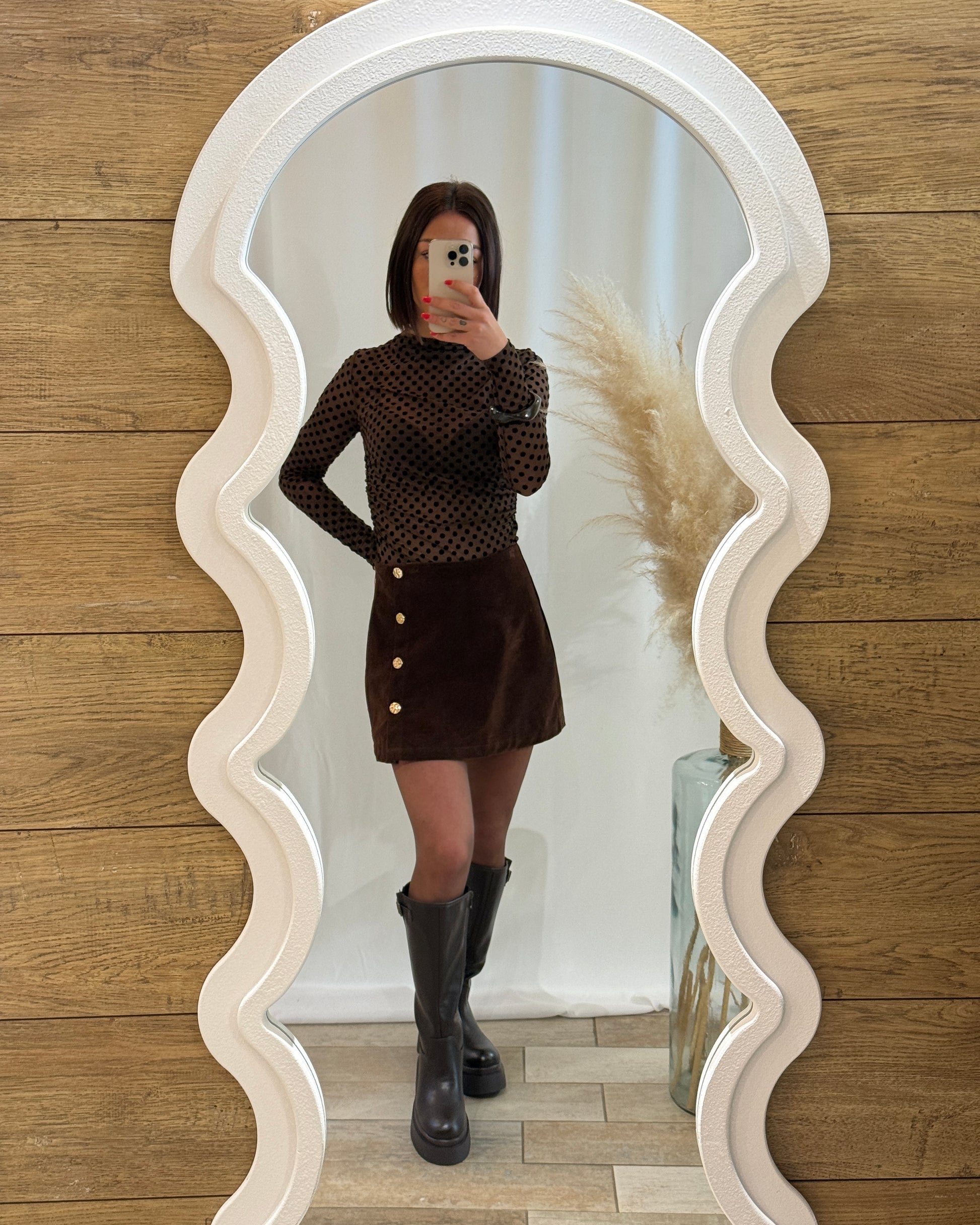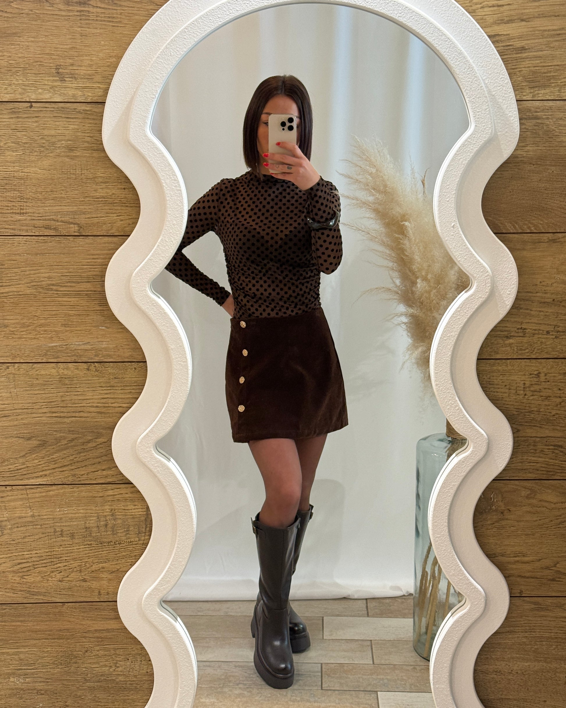 La jupe-short en velours chocolat La Maison de Manon est la pièce élégante et confortable qu’on adore porter dès les premiers froids.