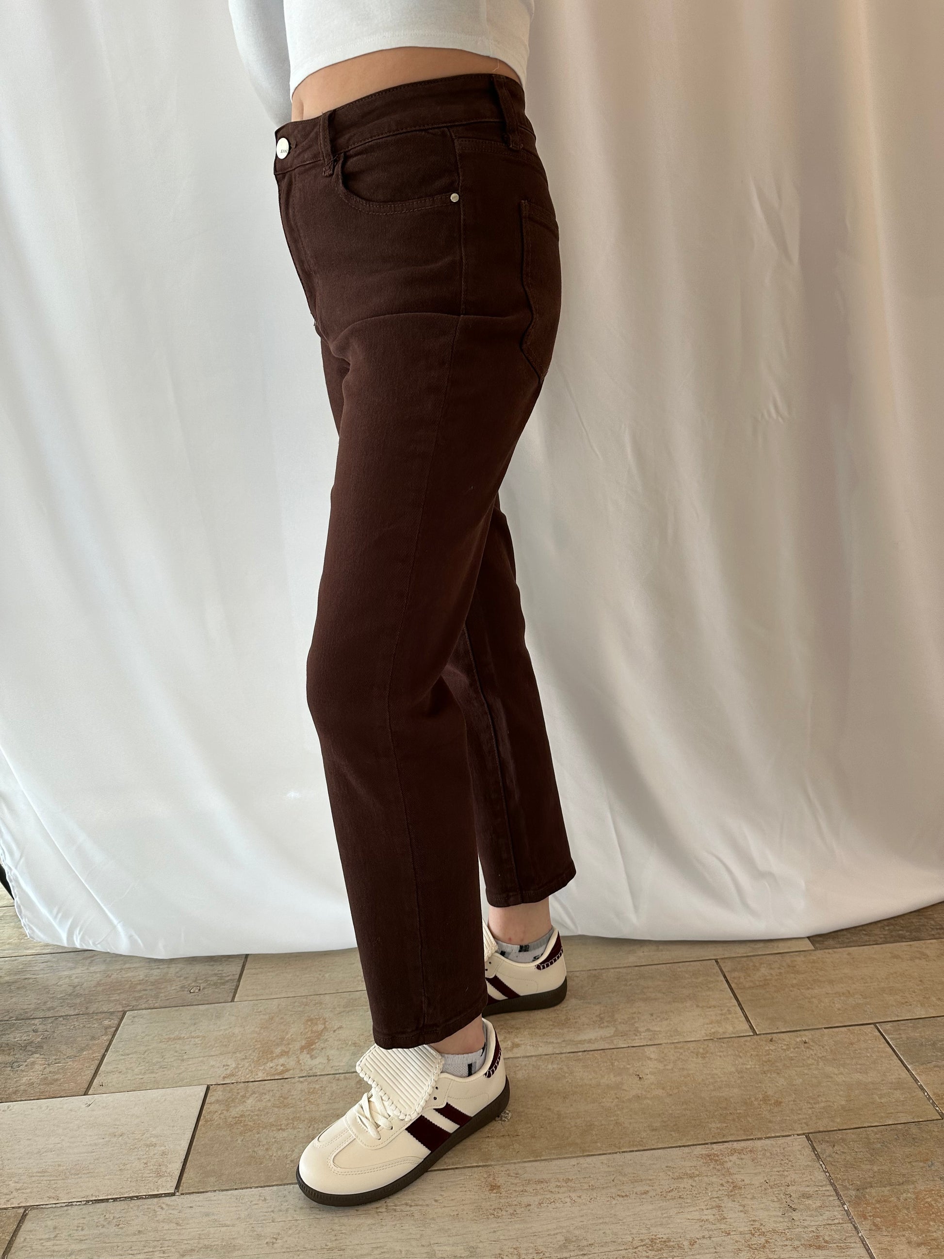 Avec sa coupe mom légèrement ajustée et son coloris chocolat, il apporte une touche chic et chaleureuse à vos looks. Sa matière souple et confortable assure un tombé impeccable tout au long de la journée.