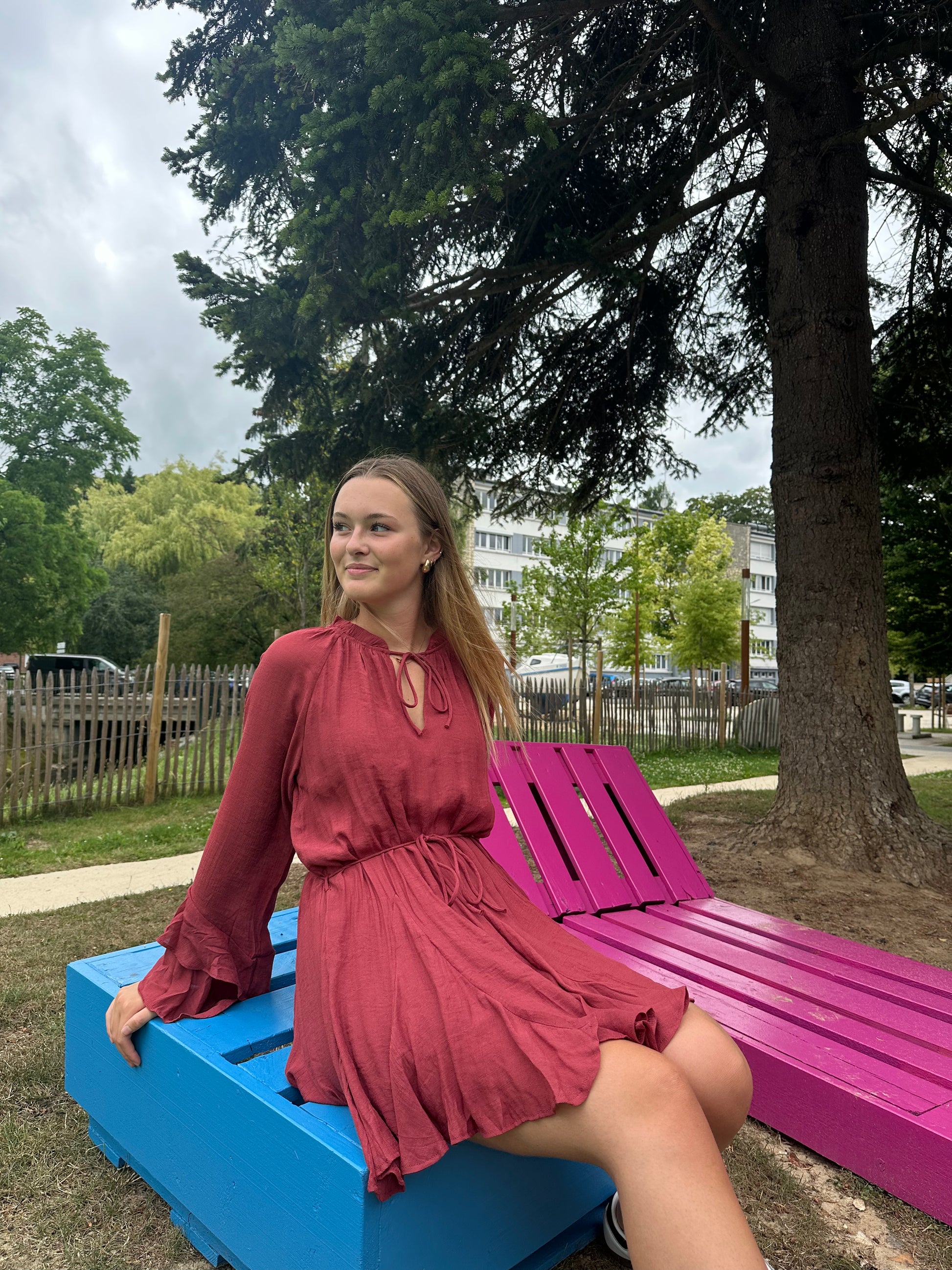 Robe fluide terracota, ceinturé à la taille. Col v avec noeud. Manche bouffie et fluide.