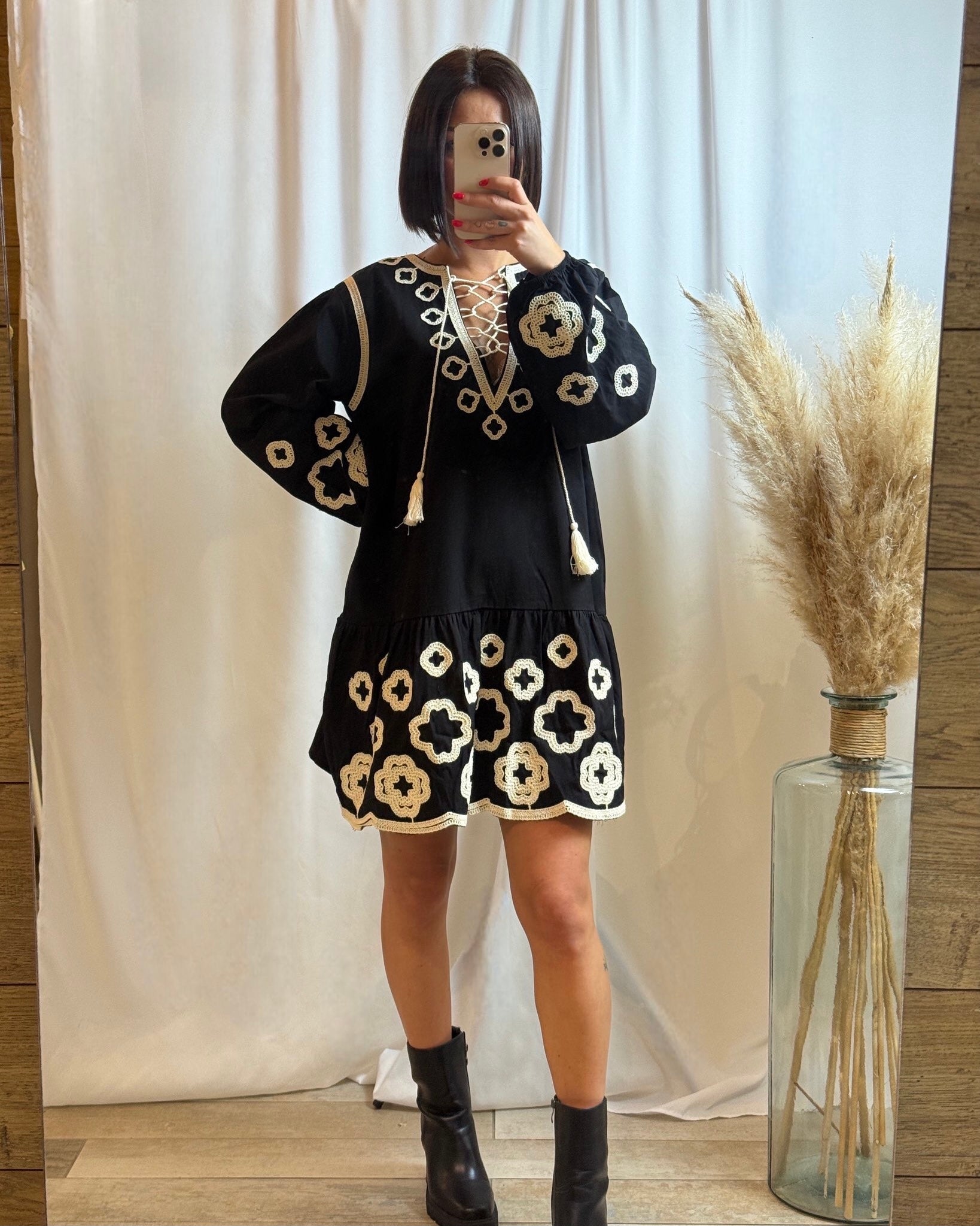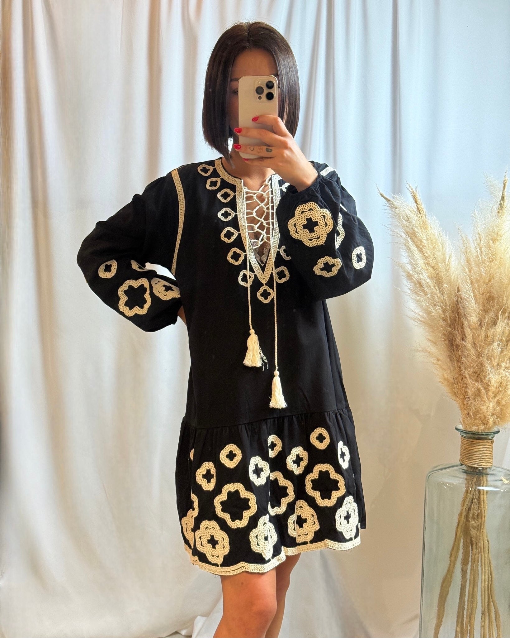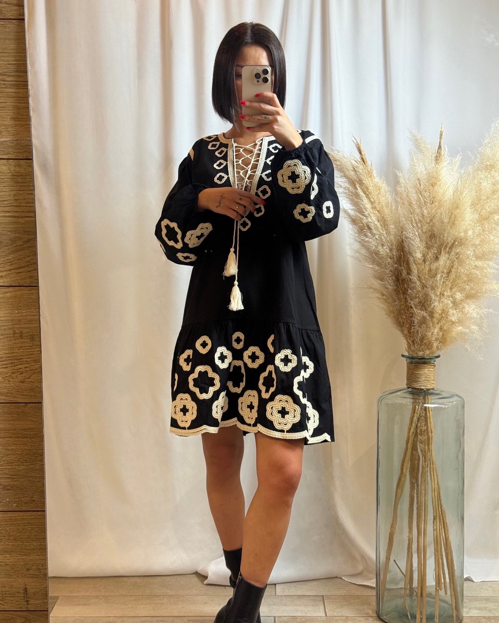 Robe brodée, avec son décolleté lacé et ses pompons style bohème chic. Avec sa coupe fluide et ses manches ballons la robe assure confort et élégance.