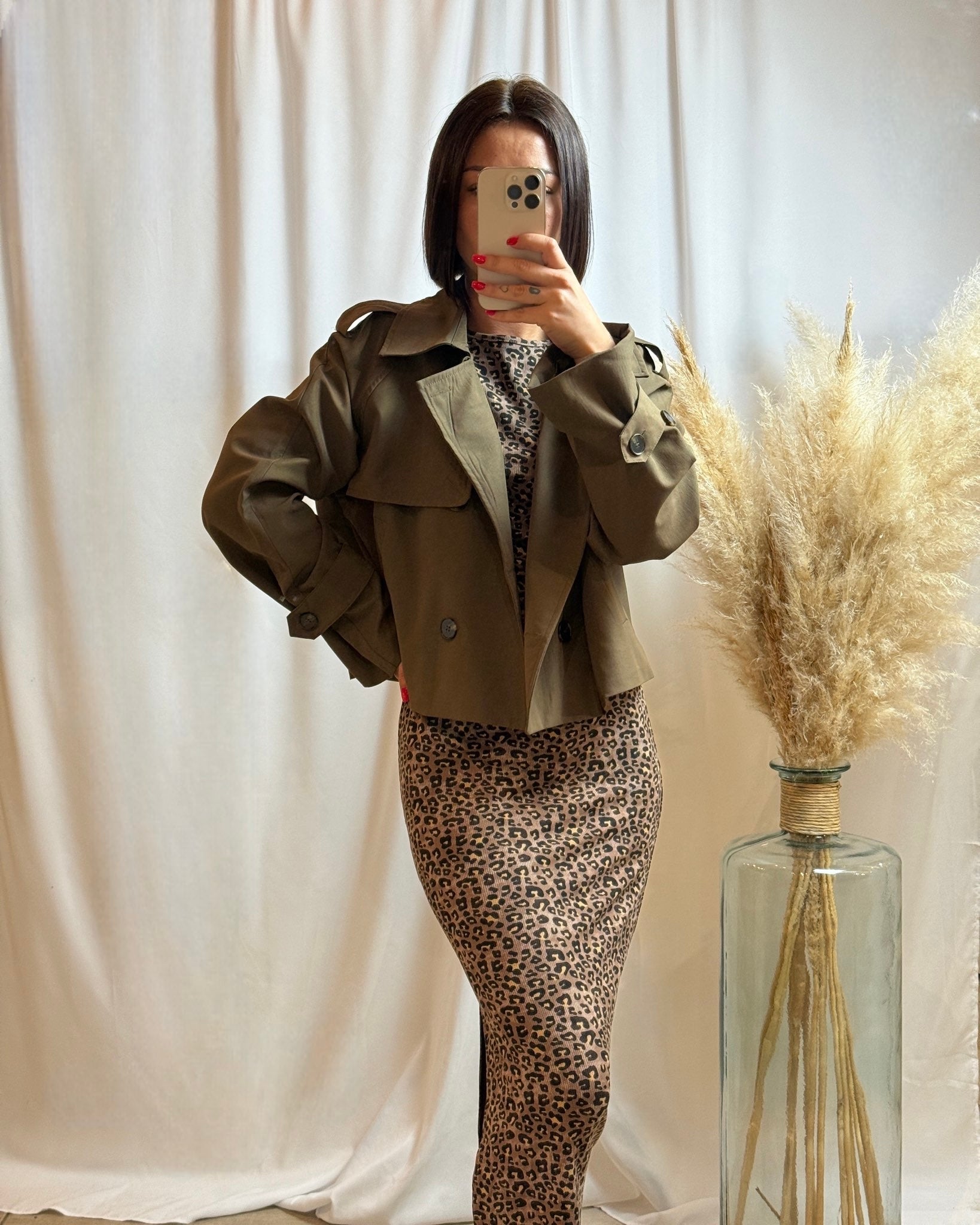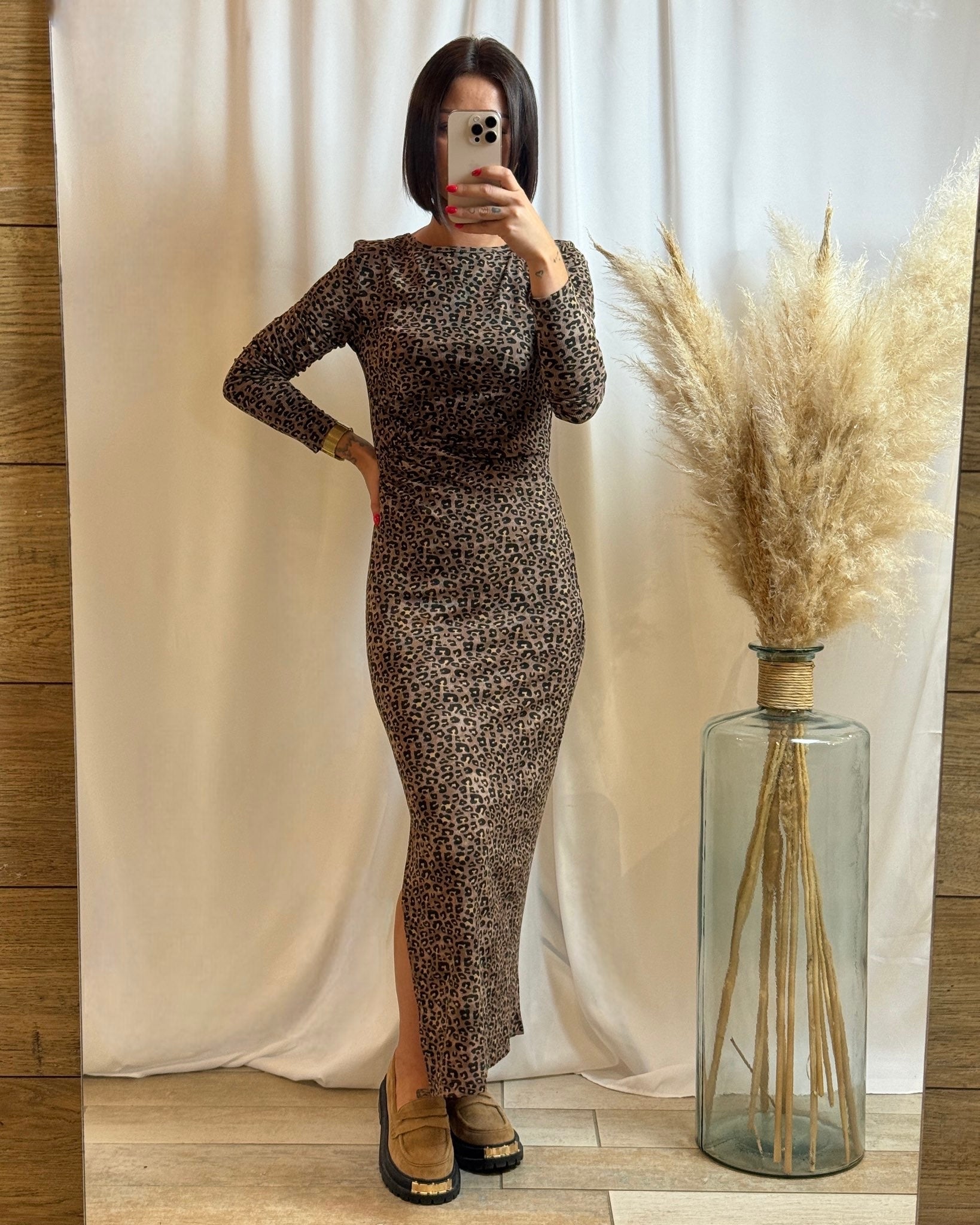 Cette robe longue à imprimé léopard met en valeur la silhouette grâce a sa coupe ajustée et son côté fendu sur le côté.