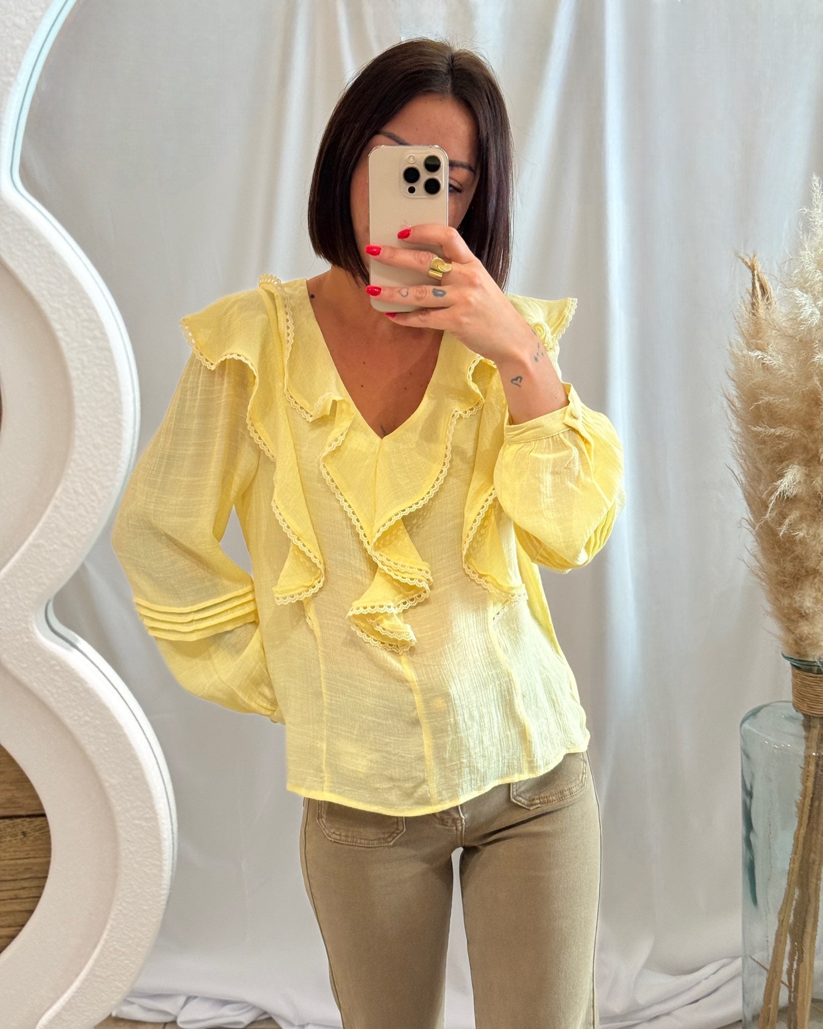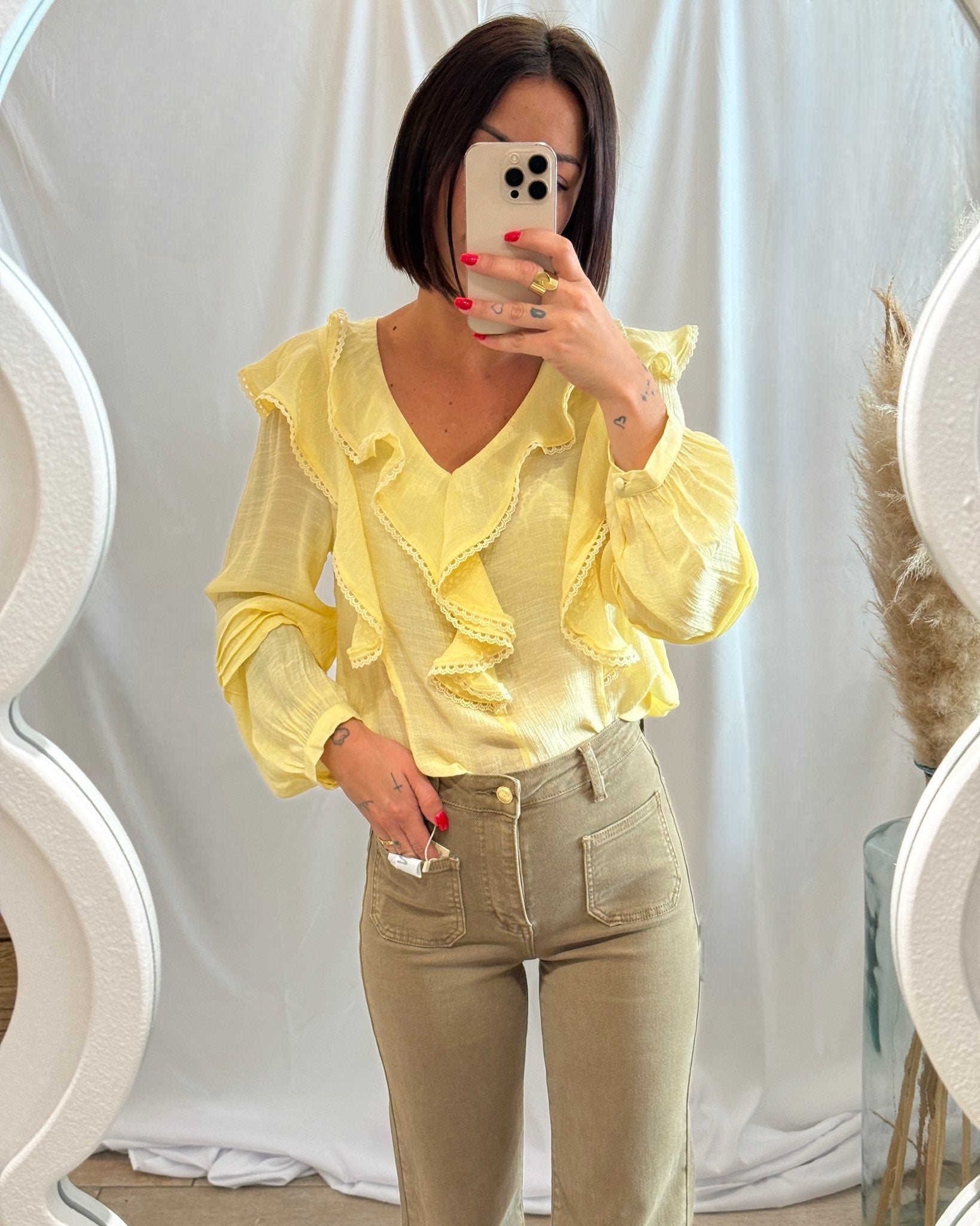 Blouse fluide et lumineuse. Son col en V et ses volants soulignent le buste, sa coupe fluide assure confort et légèreté.