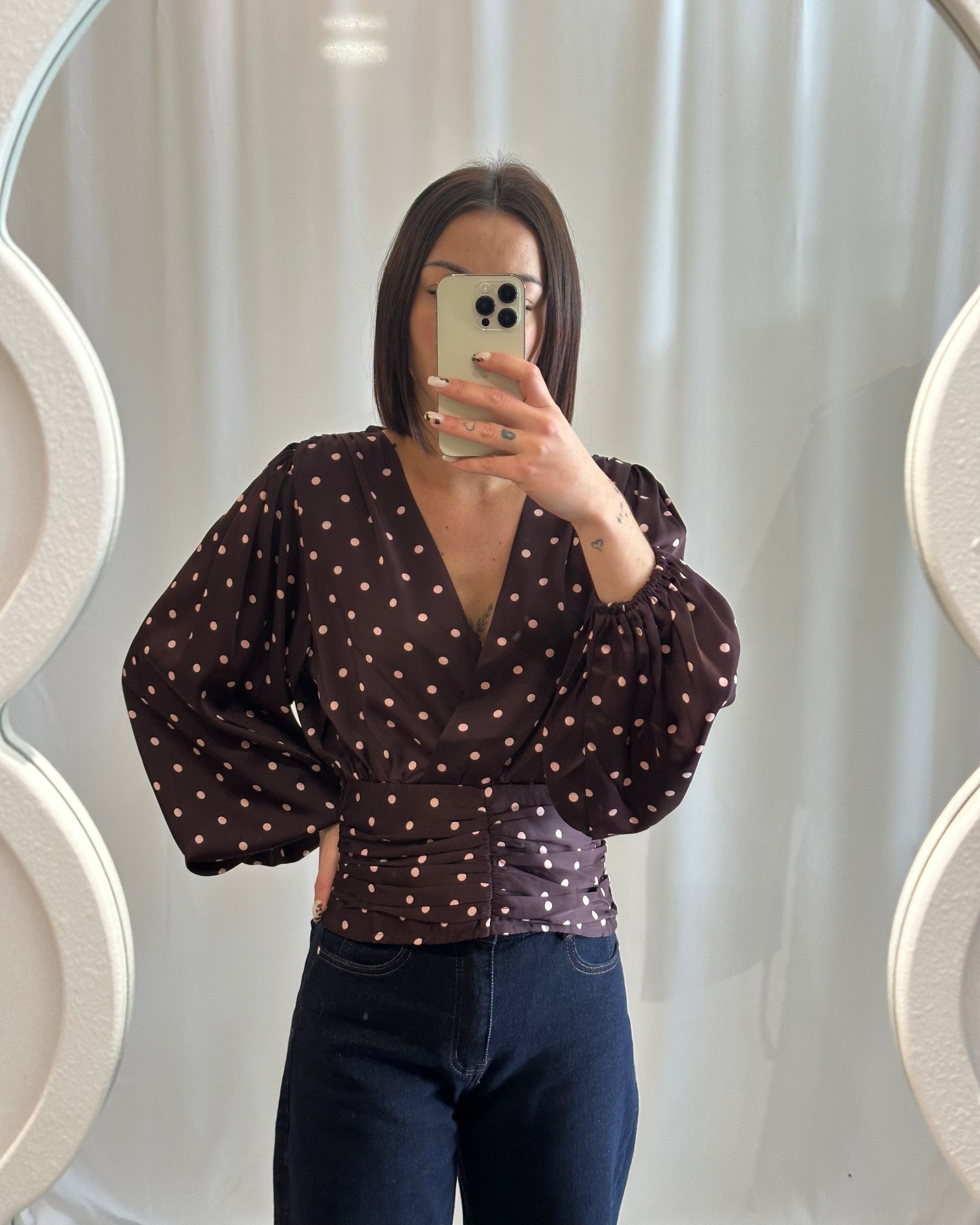 Ce top prune à pois roses apporte une touche chic et raffinée à vos tenues de saison.