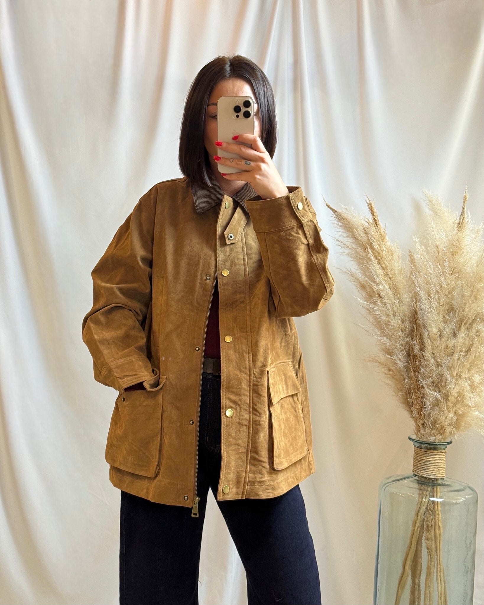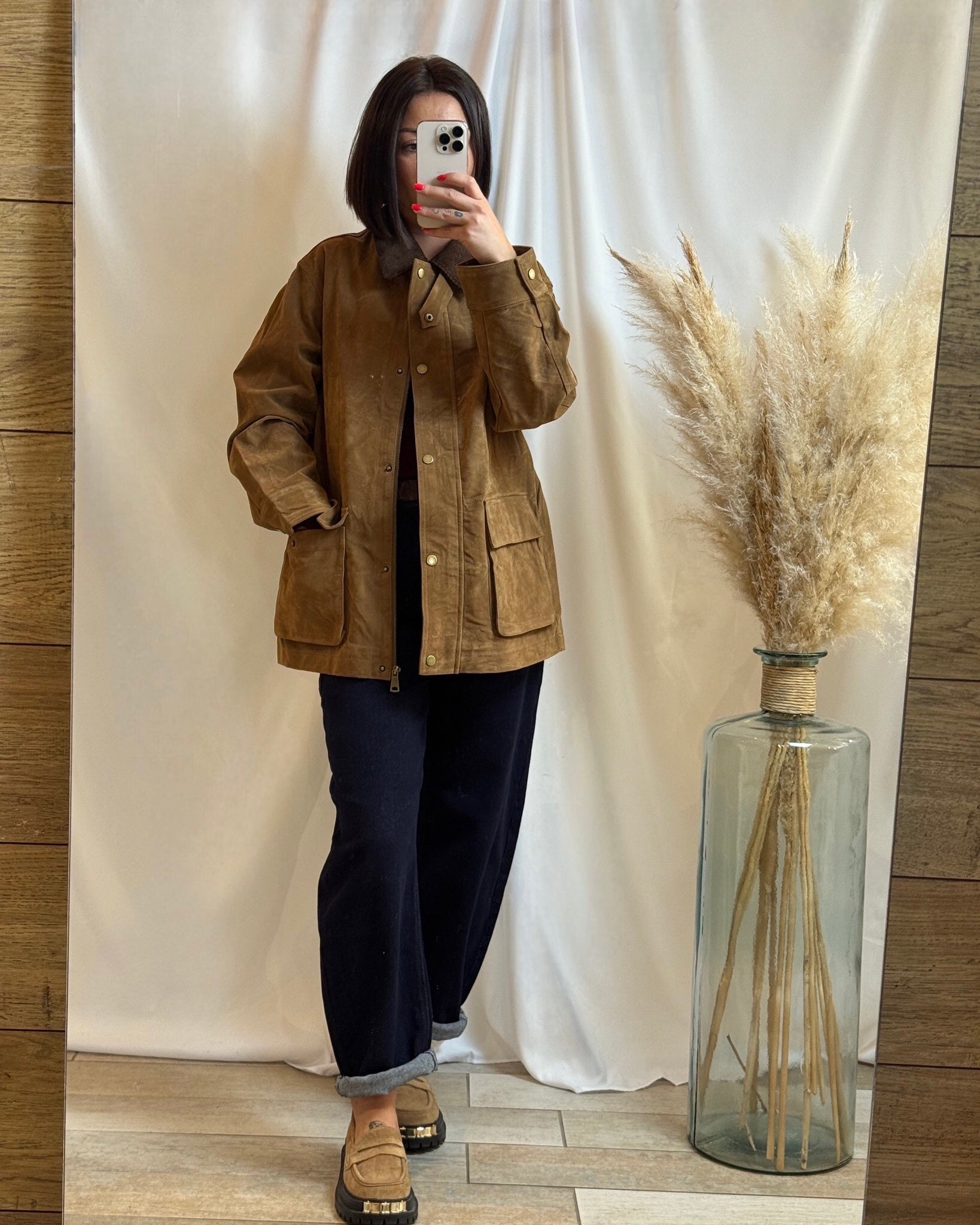 Veste Camel effet suédé, coupe droite et poches plaquées donne une allure décontractée mais chic.
